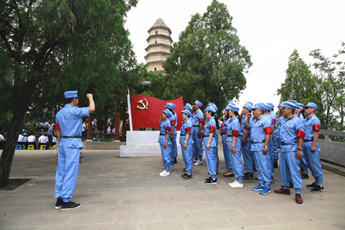 圖為黨員在梁家河合影 不顧前一天的舟車勞頓,第二天一大早,黨員們整裝出發(fā),在紅色旗幟引領(lǐng)下,頂著烈日,一路步行到達(dá)寶塔山山頂?!笆肿S土我不放,緊緊兒貼在心窩上。幾回回夢(mèng)里回延安,雙手摟定寶塔山?!本C合支部的小周對(duì)著寶塔山,情不自禁地大聲誦讀起賀敬之的《回延安》。黨員們?cè)谖∥毸赂吲e右拳,用鏗鏘有力的聲音宣讀了入黨誓詞,對(duì)于大家來說,重溫入黨誓詞是共產(chǎn)黨員表達(dá)自己為共產(chǎn)主義奮斗終生的最佳方式,黨員們的心靈再次受到震撼和洗禮。