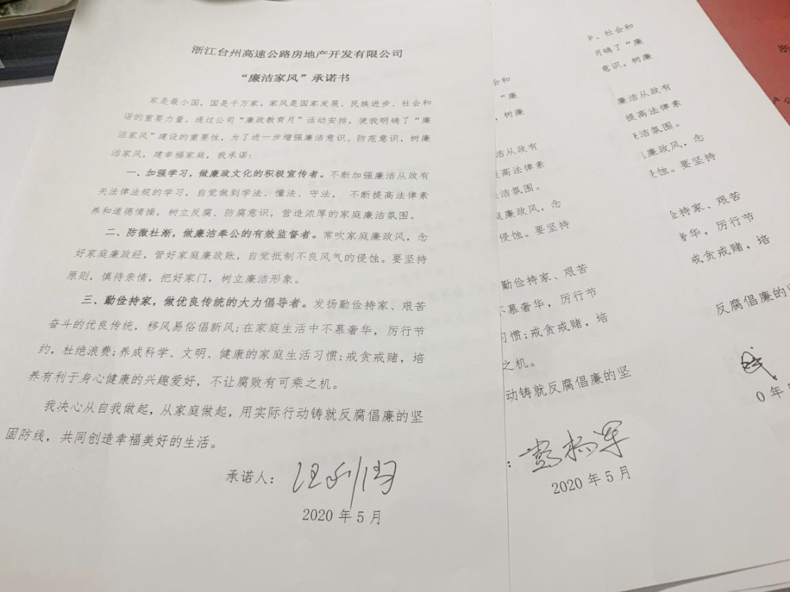 圖為全體黨員觀看廉政教育短視頻《國畫》  圖為簽訂“廉潔家風(fēng)”承諾書 根據(jù)集團(tuán)公司《關(guān)于組織開展“廉政教育月”活動的通知》文件要求,為推動“不忘初心、牢記使命”主題教育常態(tài)化,深入學(xué)習(xí)貫徹黨的十九大和十九屆二中、三中、四中全會及十九屆中紀(jì)委四次全會精神,嚴(yán)守黨的政治紀(jì)律和政治規(guī)矩,更好地落實(shí)黨風(fēng)廉政建設(shè)有關(guān)要求,高速房產(chǎn)公司黨支部組織了這次專題活動。全體參會人員一起觀看廉政教育視頻,宣讀“廉潔家風(fēng)”倡議書,簽訂“廉潔家風(fēng)”承諾書,開展“廉潔文明家風(fēng),黨員干部示范”大討論。 此次黨風(fēng)廉政專題活動進(jìn)一步增強(qiáng)了黨員干部的廉潔意識、防范意識,起到帶頭正品行、立家規(guī)、嚴(yán)家教、樹家風(fēng)建設(shè)的表率作用,以好家風(fēng)促黨風(fēng)帶社風(fēng)民風(fēng),為新形勢下臺州高速房產(chǎn)事業(yè)貢獻(xiàn)力量。 鄭攀