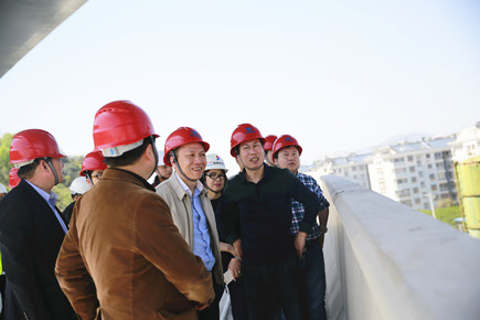 圖為公司總經(jīng)理張建平在8#立交橋上了解相關工程情況 張建平一行首先實地查看了內(nèi)環(huán)北路(江口段)項目工地,聽取工程進展情況匯報。在現(xiàn)場,只見爆破量達到70%的安然山體已經(jīng)開辟出一條可供工程車輛通行的大口子,耳邊不停地傳來機器忙碌作業(yè)的轟鳴聲。張建平一路由東向西穿行在施工便道上,看到施工區(qū)域一側各種安全防范設施有序排列,感受到沿途濃烈的施工氛圍,他對此表示滿意。 途徑內(nèi)環(huán)路8#立交項目工地時,張建平沿著臨時搭設的通道,爬上8#立交橋,遠眺8#立交放射線項目所在地,向有關人員了解該項目前期準備工作情況。眼下,距離11月11日內(nèi)環(huán)路主線通車僅剩下近半年的時間,張建平強調,各部門要努力抓好施工進度,保證工程質量,更要時刻將安全放在首位。 陳林偉