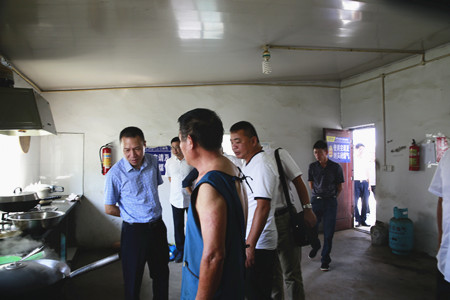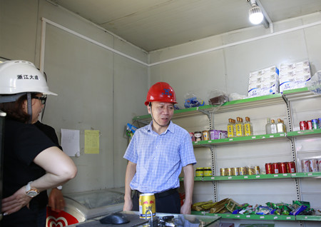圖為集團(tuán)副董事長(zhǎng)、總經(jīng)理張建平檢查內(nèi)環(huán)北路(江口段)民工食堂