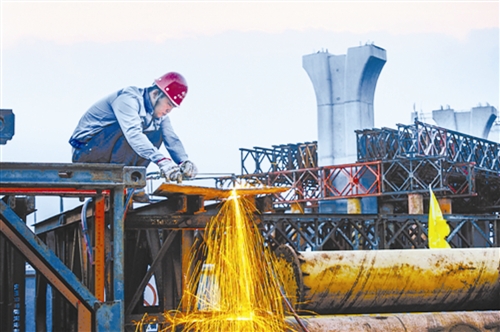 11月18日,內(nèi)環(huán)線8號立交橋上,電工楊斌正在檢修新安裝的路燈。寒風(fēng)凜冽中,來自安徽的小楊緊了緊衣領(lǐng),又嫻熟地接拉起電線來。這幾天冷空氣來勢兇猛,但為了內(nèi)環(huán)線早日通車,楊斌和他的伙計(jì)們,頂風(fēng)冒雨,只爭朝夕。